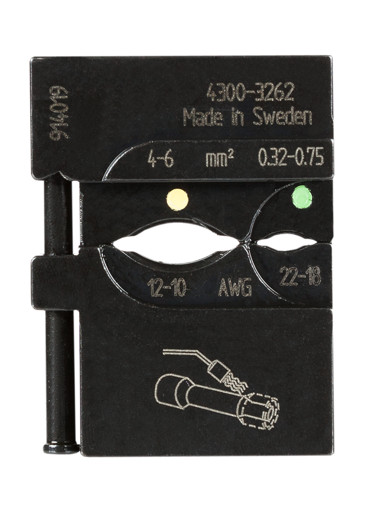 Set di matrici intercambiabili per giunti testa-testa/termoretraibili isolati, 0,32-6 mm²/AWG 22-10 (verde, giallo). È uno dei set matrici intercambiabili per il telaio MCT. Un'ampia gamma di matrici consente all'utente di soddisfare tutte le applicazioni con un unico telaio.
